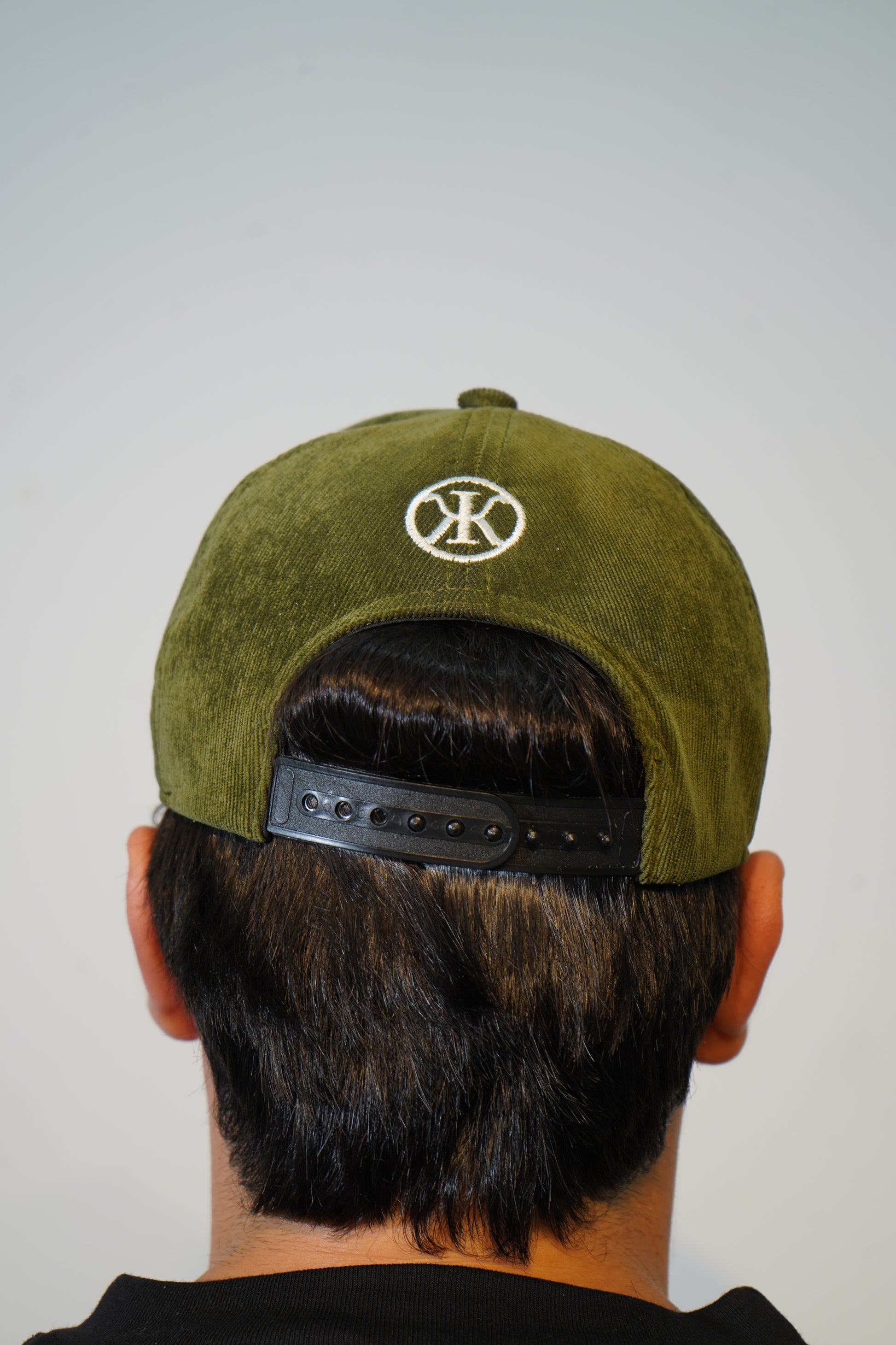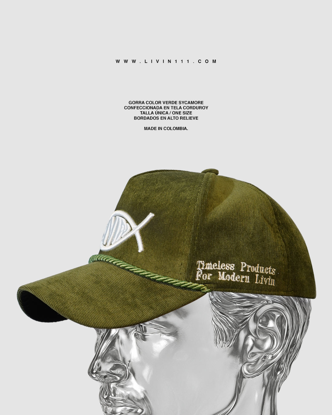 Gorra color Verde Sycamore de 5 paneles, confeccionada en tela corduroy. Presenta el diseño "Livin Infinity" bordado en el frente con alto relieve y detalles bordados en el lateral izquierdo. Además, cuenta con un bordado distintivo en la parte de atrás.